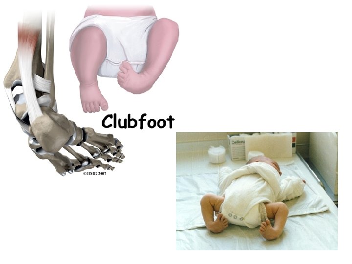 Talipes Equinovarus“Clubfoot” • Clubfoot is a deformity of the whole foot that is present at birth. There are several types of clubfoot that are jointly known as 'talipes', as the deformity is mostly in the talus (a bone in the ankle). The most common of the talipes is what is known as "talipes equino varus" - it is so common that the word clubfoot is commonly used to refer to this. In talipes equino varus, the child is born with the foot pointing down and twisted inwards at the ankle.