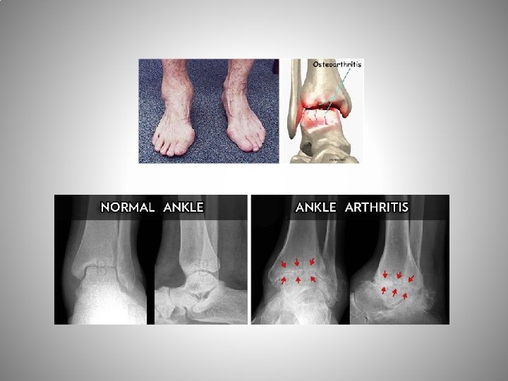 Ayak Bilek OA Ayak bileğinde en sık dejeneratif artrit Sekonder OA en sık (post travmatik) Primer OA seyri yavaş, post travmatik değişken • Erişkinlerde % 1 -4 ayak bilek OA (kalça & diz) Koksartroz ve gonartroza göre genç yaş Yük taşıyan majör eklem & nispeten küçük bir eklem yüzeyi ve yüksek temas alanları yüklenmesine rağmen NADİR İyi tasarlanmış bir menteşe eklem olmasına bağlı biyomekanik özellik & kıkırdak yapısından