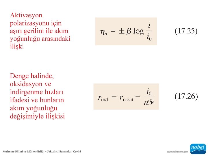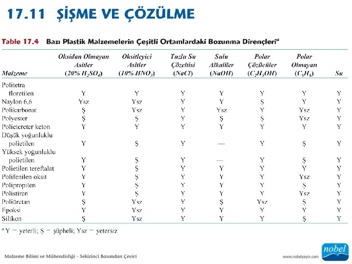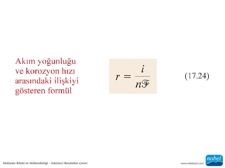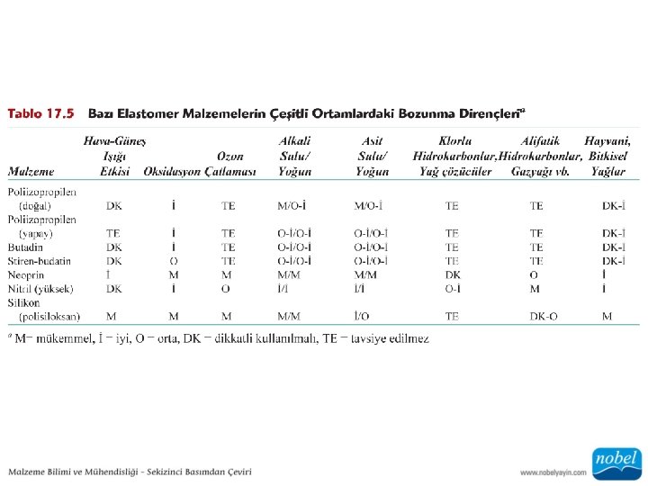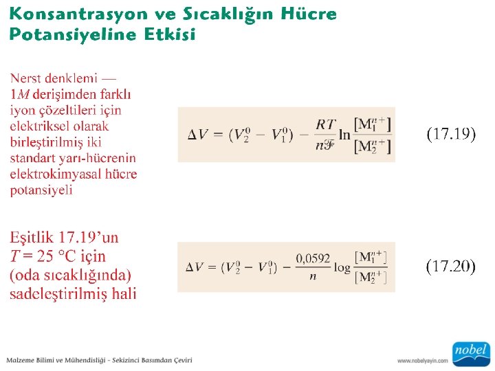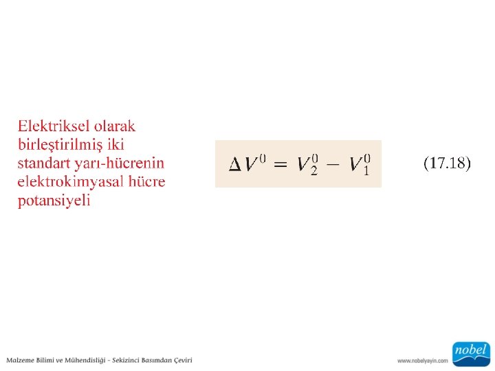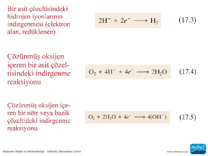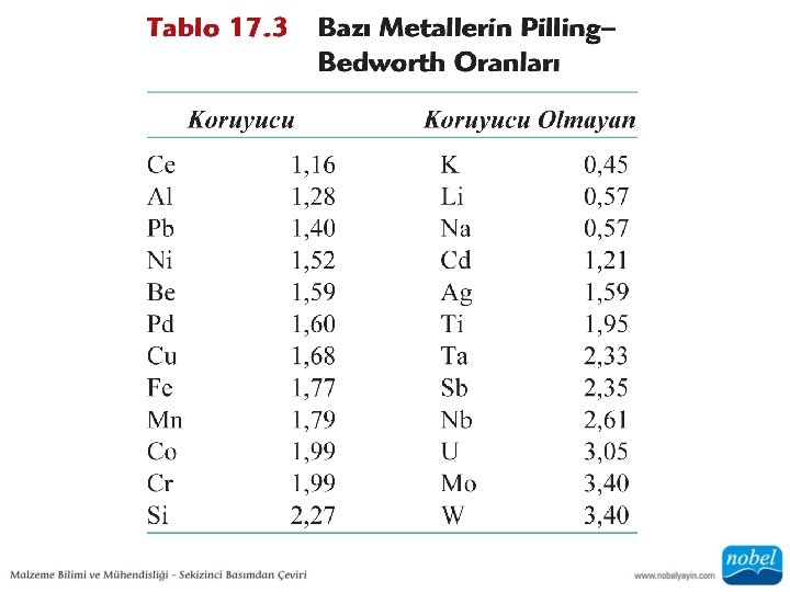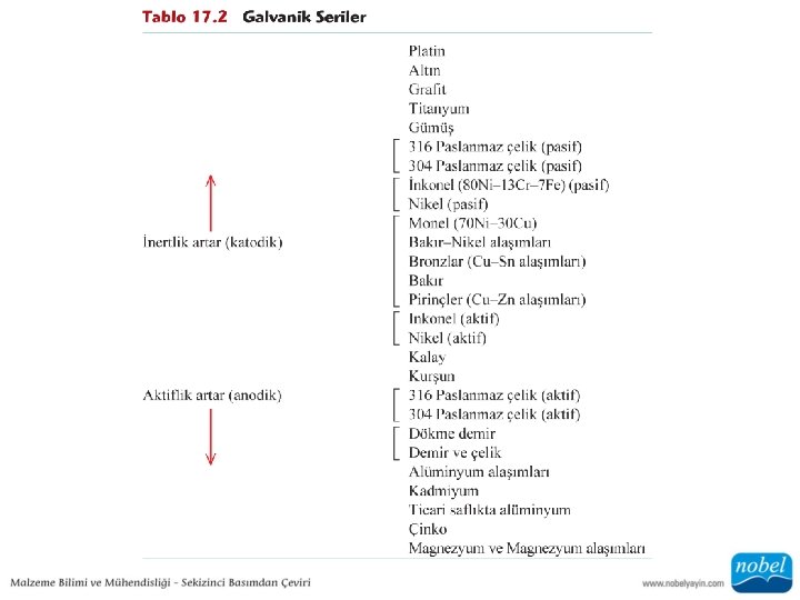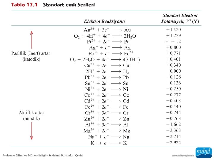 • Tablo 17. 1’deki veriler oldukça ideal koşullar için elde edilmiş olsa da bunların kullanımı kısıtlıdır. Bununla birlikte bu tablo, metallerin birbirlerine göre reaktiflik derecesini göstermektedir. Daha gerçekçi ve pratik bir sıralama ise Tablo 17. 2’deki galvanik serilerde sağlanır.