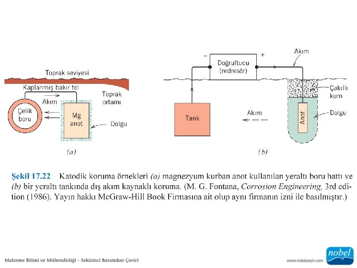 • Korozyonu önlemede en etkili araçlardan biri katodik korumadır. Katodik koruma, daha önce de belirtildiği gibi, sekiz farklı korozyon türü için kullanılabilir ve bazı durumlarda bu yöntemle korozyon tamamen durdurabilir. Burada tekrarlanacağı gibi, bir M metalinin oksidasyonu veya korozyonu, genel olarak aşağıda verilen reaksiyonla oluşur: