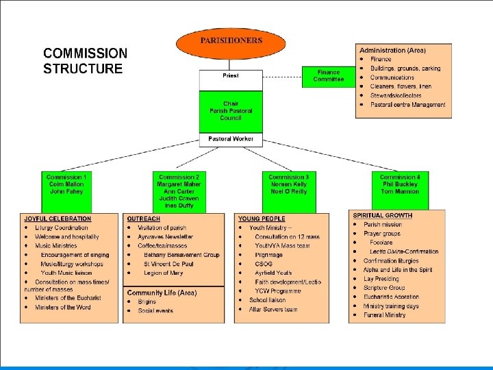 Commissions Ø Ø Ø JOYFUL CELEBRATION: Leader: Colm Mallon Liturgy Coordination Welcome and hospitality Music Ministries Encouragement of singing Music/liturgy workshops Youth Music liaison Consultation on mass times/ number of masses Ministers of the Eucharist Ministers of the Word
