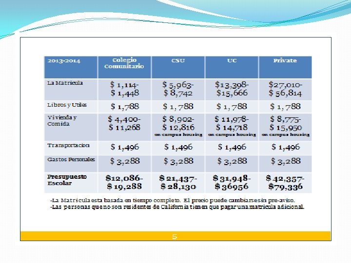 ¿Que es el Costo de Asistencia *(COA)? Cinco componentes: Matrícula y cuotas Alojamiento Libros y provisiones Transportación Gastos personales “Cargos Directos” Pagos al colegio para la matriculación, cuotas, y alojamiento (si vive en el campus) “Cargos Indirectos” El estudiante decide cuanto gasta en libros y provisiones, transportación y gastos personales, (alojamiento si vive fuera del campus) COA es diferente en CADA colegio