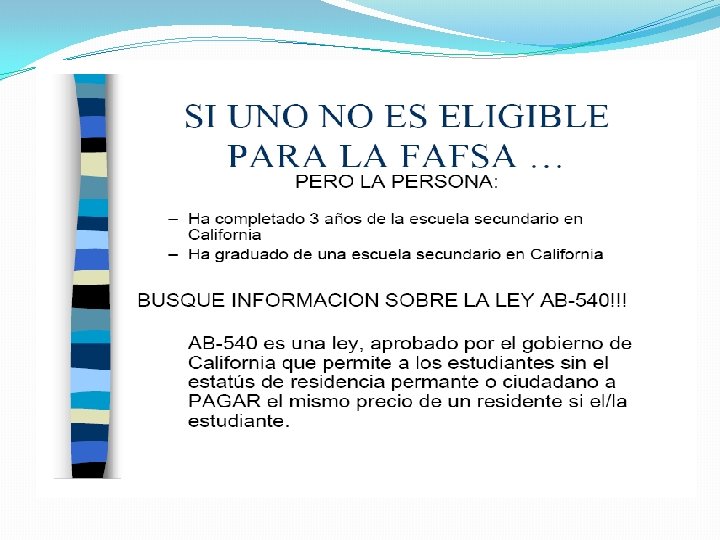 Estudiantes Indocumentados Los que han asistido y han graduado de una preparatoria de California pueden ser elegibles para AB 540 y no tienen que pagar la matrícula de no- residentes; Los estudiantes con muy buenas calificaciones/puntos quienes son elegibles para el AB 540 pueden calificar para becas del campus (consulten en el campus donde se inscriben) Todos los otros estudiantes indocumentados que no califican para AB 540 serán cargados como residentes fuera del estado de California y no serán elegibles para ayuda financiera del estado o gobierno federal. 21