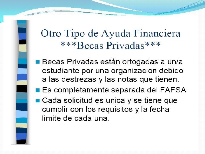 Como Abordar la Necesidad Insatisfecha y el EFC: � Trabajo de estudiante: programa de estudio y trabajo o trabajo � � � fuera del campus Presupuesto: comida, gasolina, ahorro de seguro en la casa mientras el estudiante esta en el colegio Ingreso Actual ¿puede aumentar? Crédito de Impuestos para educación Recursos de familia: Ahorros, vender los bienes, hipotecas secundarias, tarjetas de crédito, etc. Otros prestamos gubernamentales para estudiantes (PLUS Loan) Prestamos directos-al-consumidor: � � Puede afectar la elegibilidad futura de ayuda financiera Siempre hable con el departamento de ayuda financiera