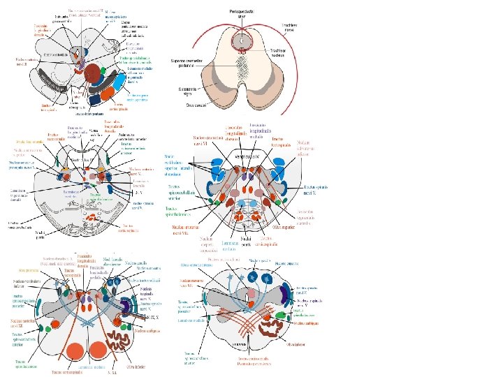 SM BM AVS SVS (= parasymp. ) (pl. baroreceptorokból, kemoreceptorokból) (=ízérzés) ASS SSS (=SVM) -dorsomedialis- -ventrolateralis- III. Nucl. n. oculomotorii Nucl. oculomotorius accessorius (Edinger-Westphal) IV. Nucl. n. trochlearis • Nucl. tr. mesencephalicus n. trigemini (behelyezett ggl. (proprioceptiv) • Nucl. sensorius principalis (pontinus) n. trigemini (epikritikus) • Nucl. tr. spinalis n. trigemini ( V. , VII. , IX. , X. protopathiás rostok) V. Nucl. motorius n. trigemini VI. Nucl. n. abducentis VII. Nucl. n. facialis Nucl. salivatorius sup. Nucl. tractus solitarii (+) - Nucl. cochlearis dors. et ventr. - Nucl. vestibularis sup. , inf. , med. , lat. Nucl. tractus solitarii (+) VIII. IX. X. XI. (C 1 -6 motoneuronok) XII. Nucl. n. hypoglossi + N. spinalis Nucl. salivatorius inf. Nucl. ambiguus Nucl. alae cinereae medialis (Nucl. dorsalis n. vagi) Nucl. alae cinereae lateralis + + +