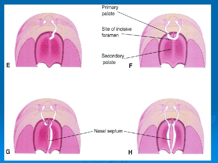 - A processus palatinusok kezdetben lefelé növekednek és a nyelv kétoldalán találhatók. - A mandibula növekedése a nyelv lesüllyedését eredményezi. - A processus palatinusok a horizontalis síkba emelkednek és egyesülnek egymással valamint a lefelé növekvő orrsövénnyel is a középvonalban. A septum nasi a medialis orrnyúlványból fejlődik.