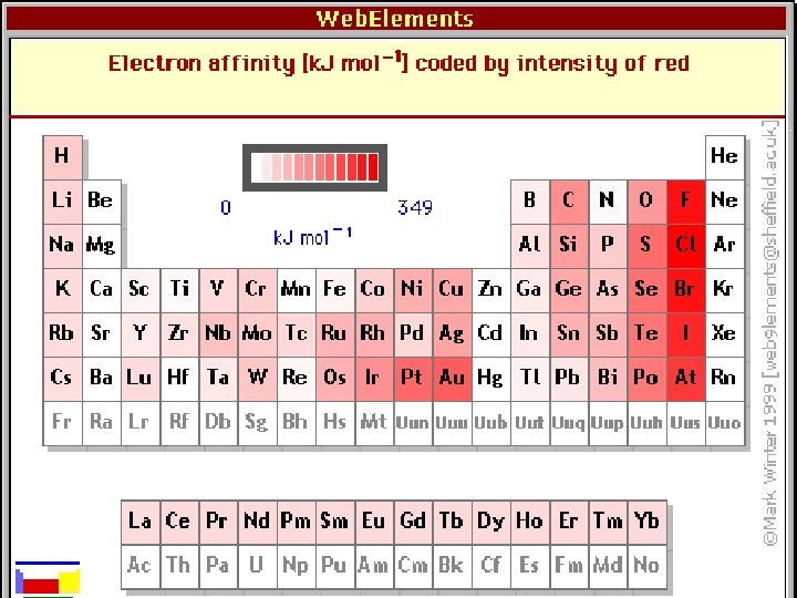 A periódikus sajátságok • Elektron affinitás: Az az energia amely akkor szabadul fel, ha egy atom, vagy molekula egy elektront felvesz. Definiálható az alábbi két módon is: 1. A−(g) → A(g) + e− magyar, Boksai 2. A(g)+ e− → A−(g) angolszász, Nyilasi IUPAC definíció: 1 -nél a befektetett energia, vagy a 2 -nél a felszabaduló energia (a kettő ekvivalens)