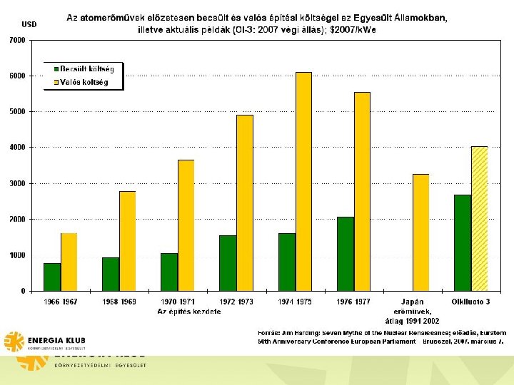 A finanszírozási probléma • Költségek növekedése (+alulbecslés az építkezés kezdetén) • Kivitelezés elnyúlása ( költségek további növekedése!) • Állami támogatások elapadása • Villamosenergia-piac liberalizációja (kizárja az állami forrásokat) • Az atomenergia versenyképtelen • Építés (és leállítás…? ) helyett: üzemidőhosszabbítás: a nukleáris ipar a túlélésre játszik