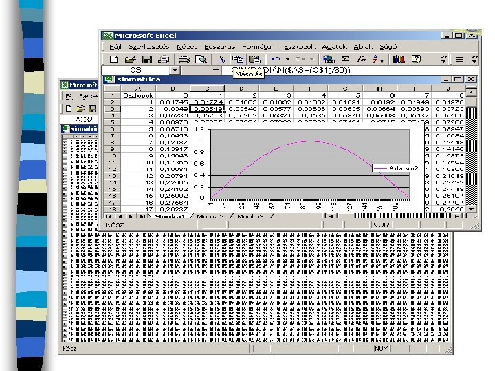 Adatok és műveletek Cella tartalma: konstans adat vagy kifejezés lehet Konstans adat típusa: • numerikus(előjel, számjegy, tizedespont, tizedes vessző) • karakteres • dátum • idő Kifejezés: =, -, + jelek egyikével kezdődik • a cellában a kifejezés konkrét értéke jelenik meg (nem a képlet!) • a szerkesztőmezőben maga a kifejezés