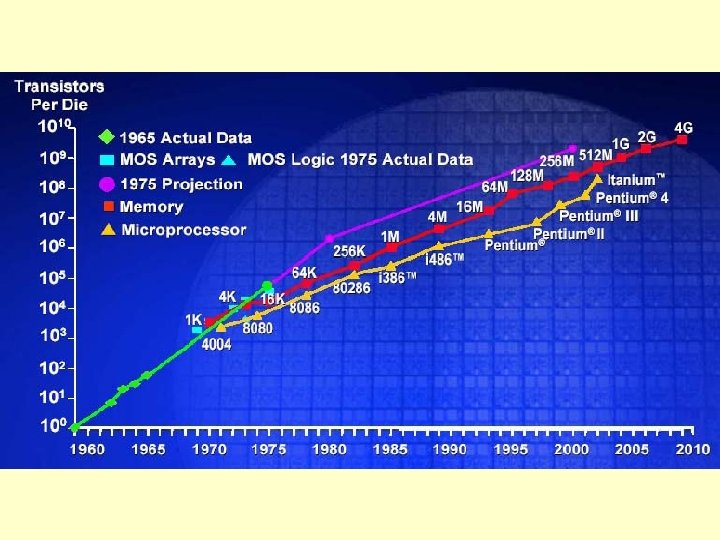 Moore törvény • • In 1965, Gordon Moore predicted that the number of transistors that can be integrated on a die would double every 18 to 14 months • i. e. , grow exponentially with time Amazing visionary – million transistor/chip barrier was crossed in the 1980’s. – 2300 transistors, 1 MHz clock (Intel 4004) - 1971 – 42 Million, 2 GHz clock (Intel P 4) - 2001 – 140 Million transistor (HP PA-8500) Source: Intel web page (www. intel. com)