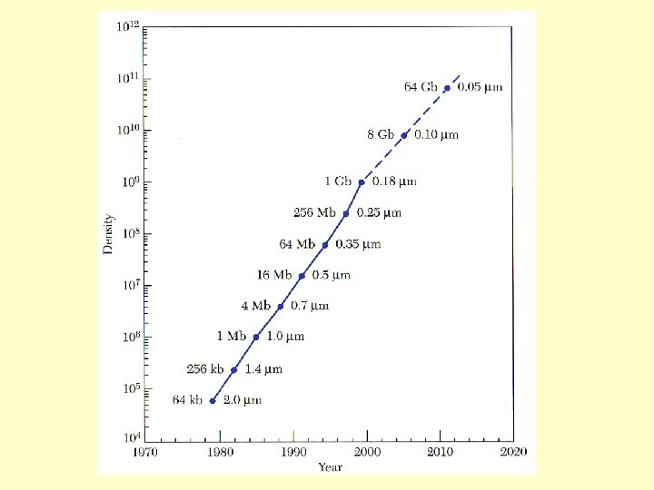 Az útiterv jóslatai Alkatrész-szám, memória bitkapacitás DRAM bitkapacitás P alkatrész-szám DRAM: 64 M/1995 64 G/2010 Moore-törvény: kétszereződés 1, 5 évente