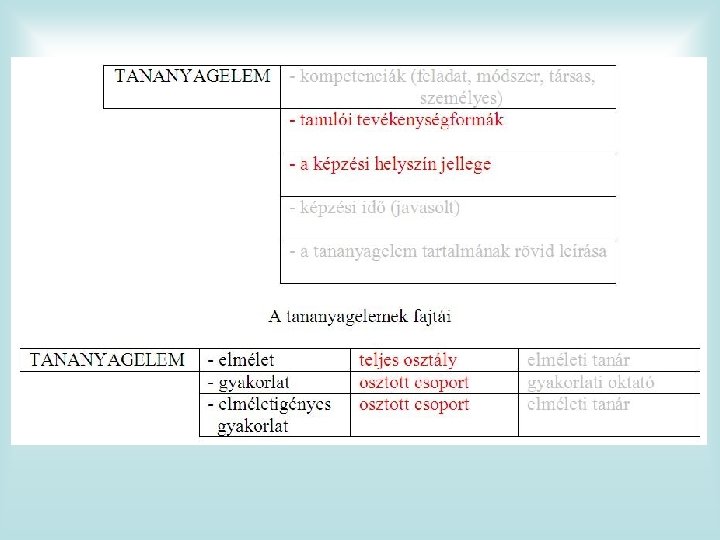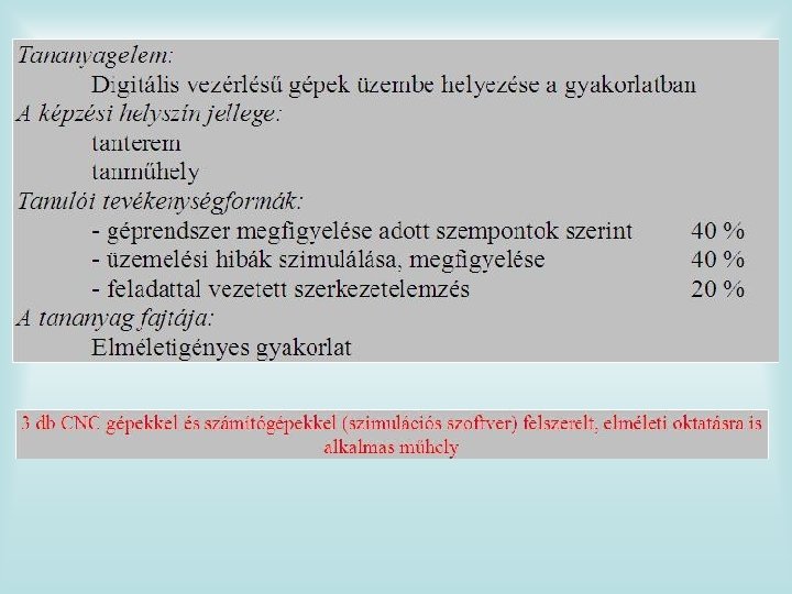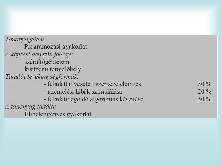 Tanulói tevékenységformák • • • hallott szöveg feladattal vezetett feldolgozása olvasott szöveg feladattal vezetett feldolgozása információk feladattal vezetett rendszerezése tapasztalatok utólagos ismertetése szóban kiscsoportos szakmai munkavégzés irányítással mérési gyakorlat írásos elemzések készítése önálló szakmai munkavégzés csoportos megbeszélés irányított csoportos munkavégzés szakmai munkatevékenység megfigyelése egyszerű számítási és tervezési feladatok önálló megoldása • • • • szöveges előadás egyéni felkészüléssel csoportos helyzetgyakorlatok tesztfeladat megoldása információk önálló rendszerezése hallott szöveg feldolgozása jegyzeteléssel információk rendszerezése mozaikfeladattal adatgyűjtés elemzés készítése tapasztalatokból megfigyelés adott szempontok alapján leírás készítése hibák számlálása és megfigyelése algoritmus készítése műszaki rajz készítése leírásból feladattal vezetett szerkezetelemzés rajz értelmezése