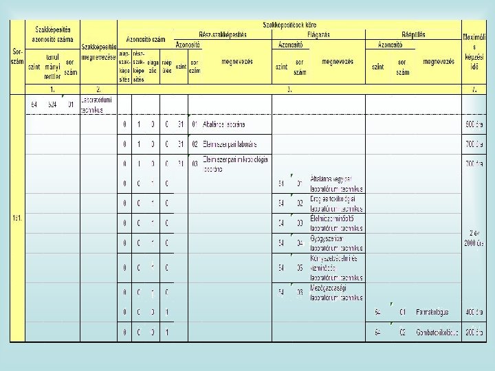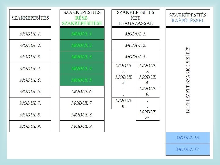 • iskolarendszerben csak azok a szakmák képezhetők, amelyek képzési ideje évben adott • ez lehet alapszakma is, ha nincs leágazása, de jellemzően a leágazások jelentik az iskolák számára a szakmaválasztékot • rész szakképesítésre nem lehet beiskolázni • ráépülésként szereplő szakképesítésre csak befejezett alapszakma, vagy leágazás után lehet beiskolázni.