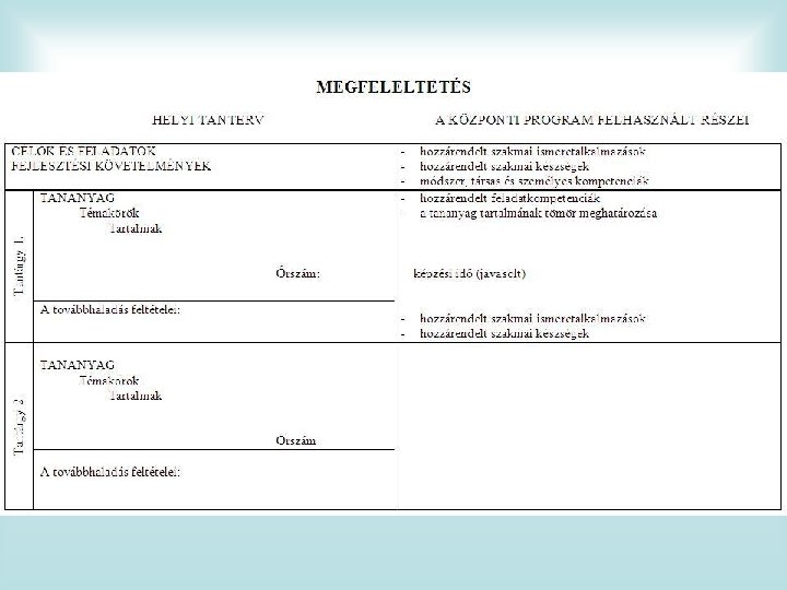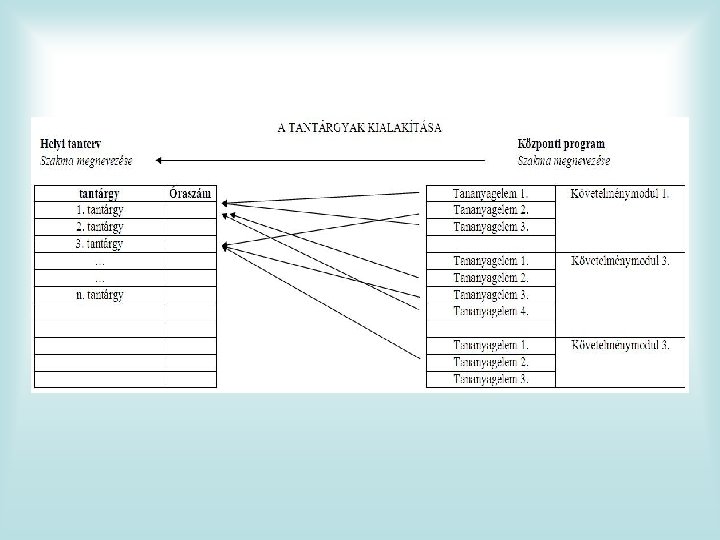 A helyi tanterv elkészítésének lépései 1. A tananyag összeállítása 2. A tananyag tantárgyakra bontása 3. A tantárgyak évfolyamonkénti elrendezése 4. Az óratervek elkészítése 5. A helyi tanterveknek megfelelő formai elrendezés