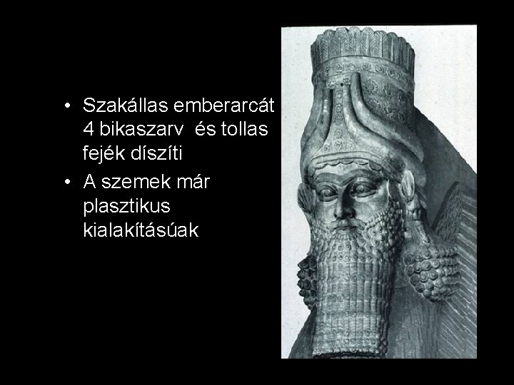 c/ Lamassu (kapuőrző démon), i. e. 8. sz. • Az asszír királyok palotáit (Dúr-Sarrukín) különös lények őrizték • A több mint 4 m magas alabástrom szobrok, furcsa összetett lények: ember, bika, oroszlán, sas (evangélista szimbólumok János apokalipszisében)