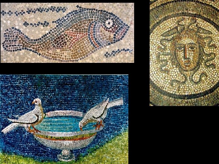 Mozaikok - - Az épületeket gyakran mozaikokkal díszítették. - - Szépségük felvették a versenyt a falfestményekkel. - - téma: természeti és mitológiai ábrázolások -