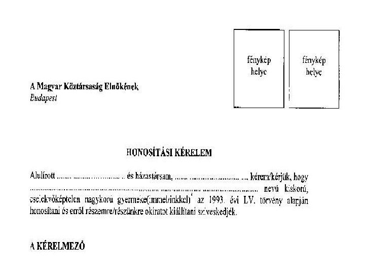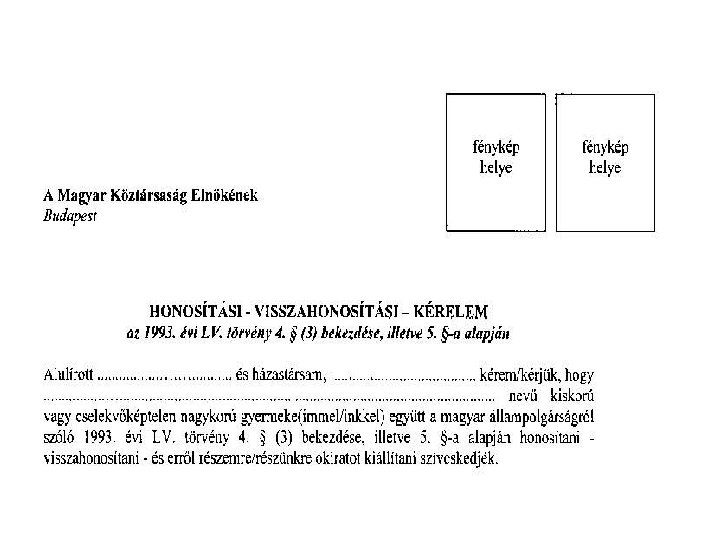 Visszahonosítás mellékletei • Személyi adatok, családi állapot, névviselés igazolása • Kézzel írott önéletrajz • Arcfénykép • Az egykori magyar állampolgárság igazolása, pl: elbocsátási, lemondási okirat