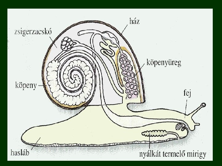 Csigák osztálya testtájak: fej ( tapogatók, hólyagszem, szájnyílás, állkapocs, reszelőnyelv ) hasláb ( izmos, mirigyes ) zsigerzacskó ( belső szervekkel) Ház: aszimmetrikus, spirálisan felcsavarodott Légzés: „csigatüdővel” (köpenyüreg érdús falán keresztül), v. kopoltyúval Szaporodás: petével, a fejlődés közvetlen