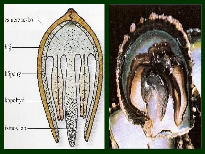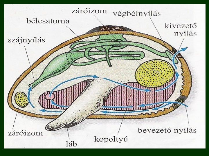 Kagylók osztálya Testtájak: tolóláb ( izmos ) zsigerzacskó, köpeny Külső váz: héj (két teknőből, szimmetrikus) Légzés: kopoltyúval Szaporodás: petével, átalakulásos fejlődéssel Táplálkozás: kétnyílású, háromszakaszos bélcsatorna Szerves törmelék kiszűrése a vízből Élőhely: édes- és sós víz