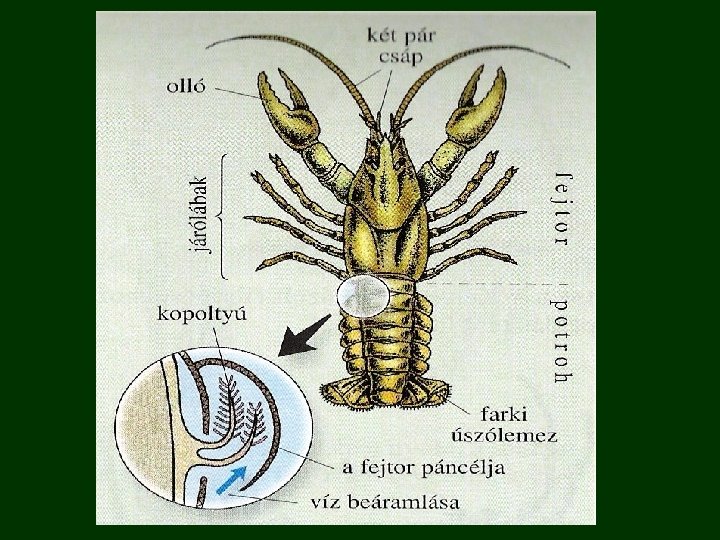 Rákok osztálya Testtájak: fejtor, potroh 5 pár járóláb ( + lehetnek potrohlábak, melyek az ivadékgondozásban játszanak szerepet) 1 Pár járóláb ollóvá módosult támadás, védekezés, táplálék megragadása Mészben gazdag kitinpáncél