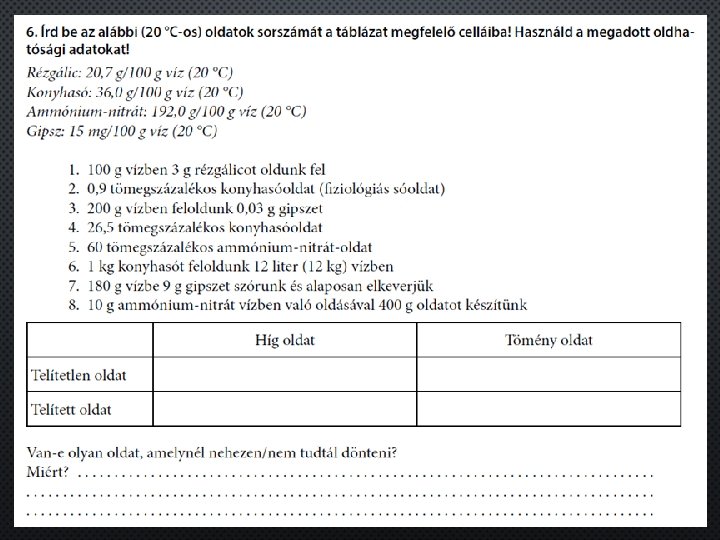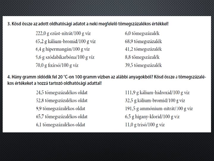 telített oldat amely adott hőmérsékleten már több anyagot nem képes feloldani telítetlen oldat amely adott hőmérsékleten még képes feloldani több anyagot