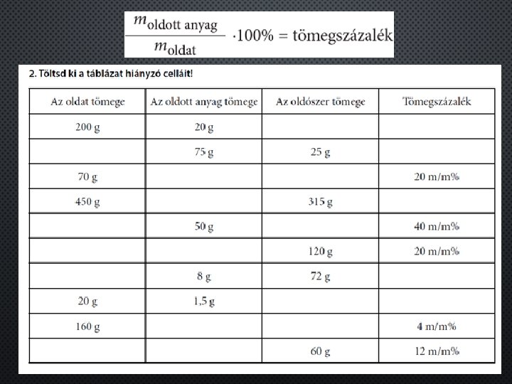 A tömegszázalék Az oldatok töménységét, vagyis azt, hogy az adott oldat mennyi oldott anyagot tartalmaz, leggyakrabban a tömegszázalékkal (m/m%) fejezzük ki. A tömegszázalék megmutatja, hogy 100 gramm oldat hány gramm oldott anyagot tartalmaz.