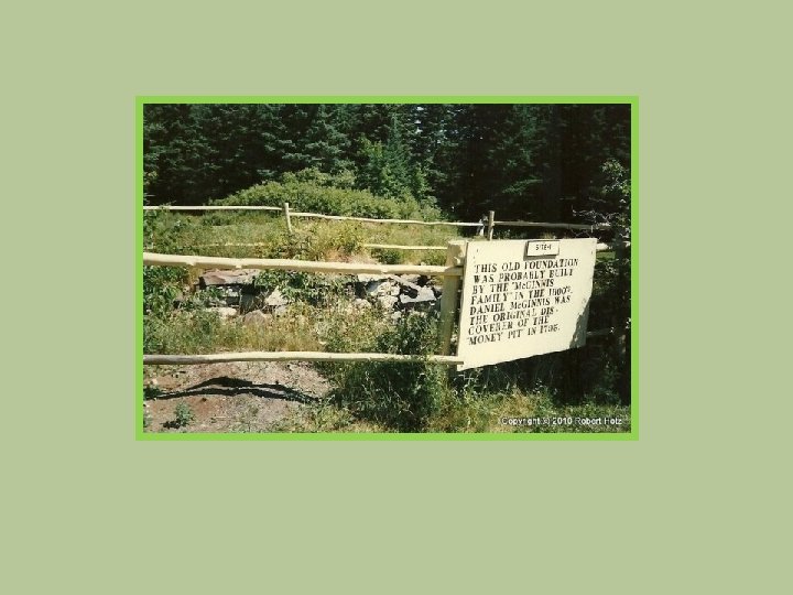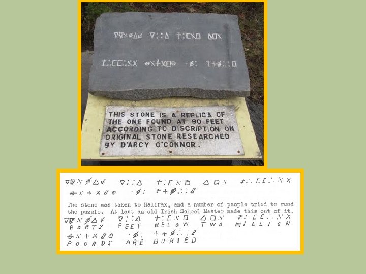 Povestea a inceput in 1795, la un secol dupa ce, la Londra, a fost spanzurat capitanul KIDD, unul dintre cei mai de temuti pirati ai omenirii. Legenda spune ca el si-ar fi ingropat aici comoara inestimabila. In 1795, niste copii au descoperit un loc mai adancit, care le-a atras imediat atentia si au inceput sa sape. Au dat peste un strat de dale din piatra( la 6 m. ) si altul din bile de stejar(la 9 m. )