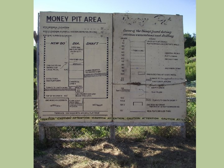 THE MONEY PIT OAK ISLAND ( GROAPA COMORII DIN INSULA OAK) Dupa ce s-a descifrat si textul de pe dala de piatra- LA O ADANCIME DE 40 DE PICIOARE SUNT INGROPATE 2 MILIOANE DE LIRE – cautarile au devenit si mai ample. Dar nu s-a reusit sa se scape de apa care umplea groapa. In 1849, Compania. TRURO a facut noi incercari, sapand un alt put, in apropierea celui vechi. Tot fara succes. Rand pe rand, tentativele de a descoperi comoara au esuat, desi in 1897 s-a descoperit un pergament in timpul sapaturilor, care le-ar fi dat unele sperante: insa acesta a disparut in mod misterios.