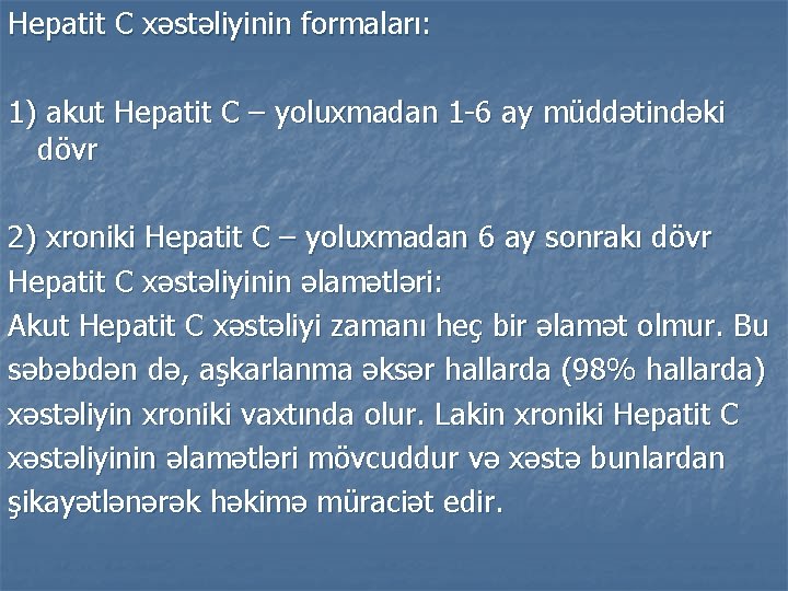Hepatit C xəstəliyinin formaları: 1) akut Hepatit C – yoluxmadan 1 -6 ay müddətindəki dövr 2) xroniki Hepatit C – yoluxmadan 6 ay sonrakı dövr Hepatit C xəstəliyinin əlamətləri: Akut Hepatit C xəstəliyi zamanı heç bir əlamət olmur. Bu səbəbdən də, aşkarlanma əksər hallarda (98% hallarda) xəstəliyin xroniki vaxtında olur. Lakin xroniki Hepatit C xəstəliyinin əlamətləri mövcuddur və xəstə bunlardan şikayətlənərək həkimə müraciət edir.
