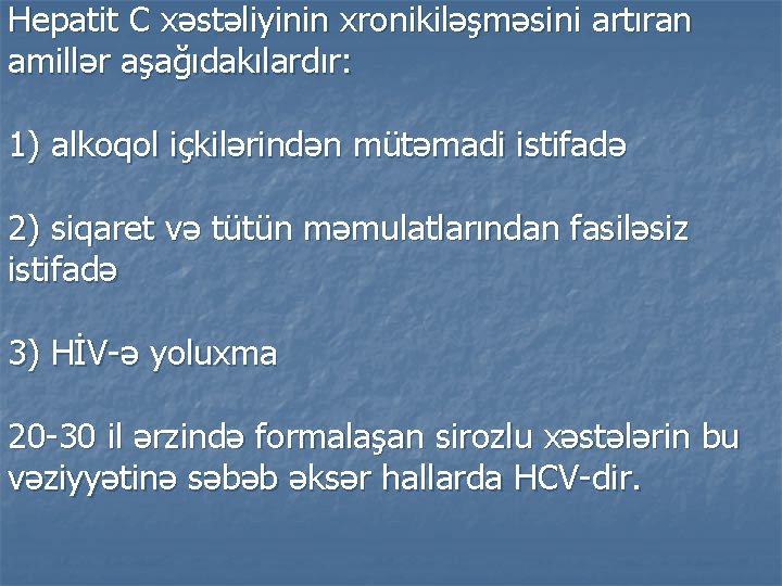 Hepatit C xəstəliyinin xronikiləşməsini artıran amillər aşağıdakılardır: 1) alkoqol içkilərindən mütəmadi istifadə 2) siqaret və tütün məmulatlarından fasiləsiz istifadə 3) HİV-ə yoluxma 20 -30 il ərzində formalaşan sirozlu xəstələrin bu vəziyyətinə səbəb əksər hallarda HCV-dir.