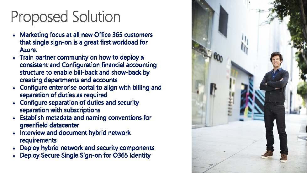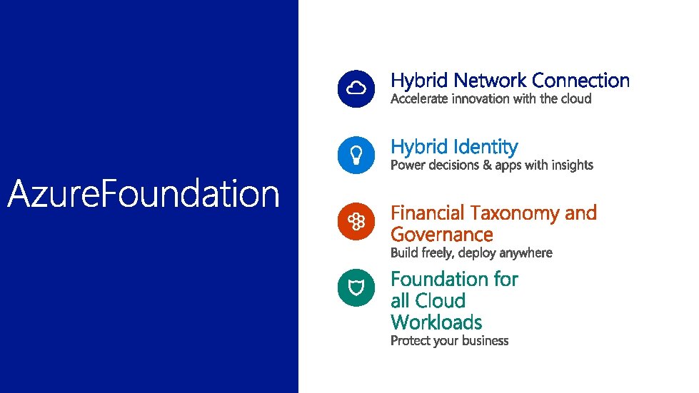 Microsoft • • • Marketing: Develop campaign materials for account teams. Account Teams: Position the Azure. Foundation in new O 365 customers Center of Excellence: Continuous improvement on the Azure. Foundation components. Partners • • • Training field workers for a consistent delivery of the Azure. Foundation. Understanding of Value Proposition includes future workloads. Identify future workloads why deploying foundation.