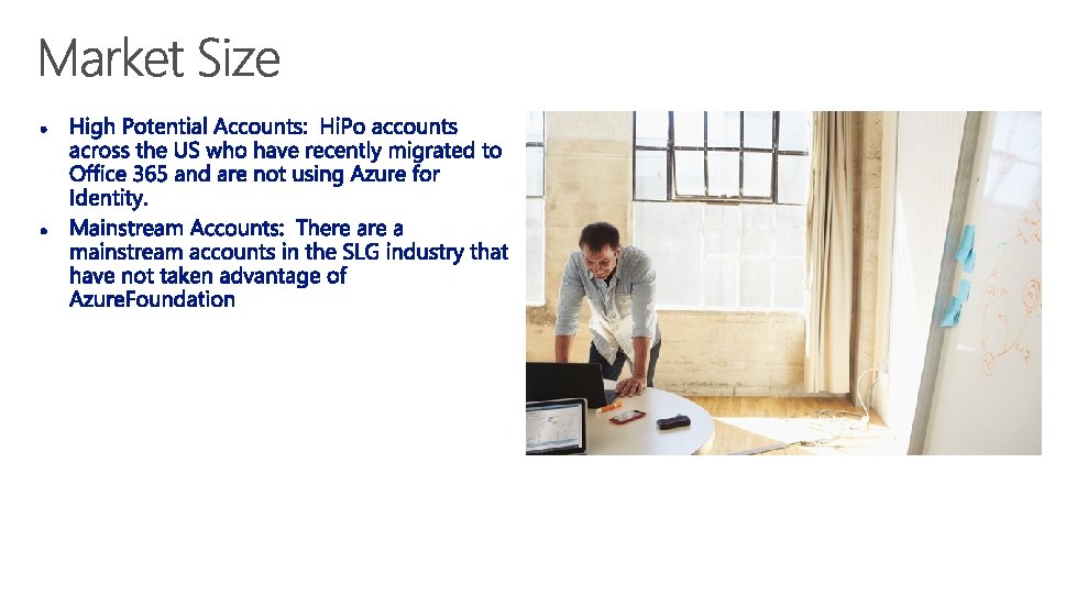 Identification of Market Existing and New O 365 customers will be approached by Microsoft’s account Teams Partner Community Training the partner community on how to position the Azure. Foundation and deploy it with consistent value statement. • Creation of Intellectual Property • Incentives • ID Follow-on Workloads