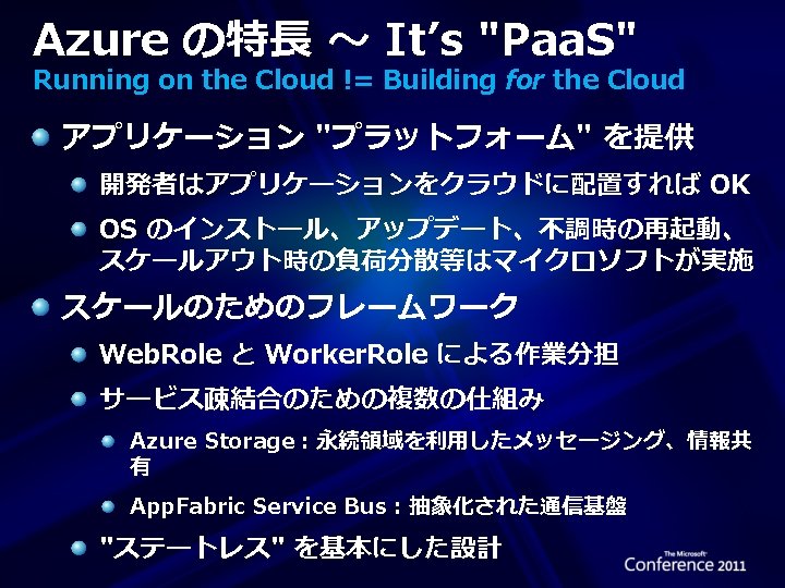 Azure の特長 ~ It’s "Windows" Windows 環境での開発 Visual Studio と. NET Framework による高生産性 クラウドで使用できるテクノロジ選択の自由度 Web. Form(生産性)、MVC(拡張性)、Razor(簡便性)、 Silverlight(RIA) 共通テクノロジーで広範な応用領域 PC、Windows Phone、Xbox、センサー等 Windows で培われたインターオペラビリティ PHP、Java、Node. js、Ruby、Perl、Erlang、 Common LISP、Python、Objective-C 用ライブラリ Windows Phone、i. Phone、Android 用 Toolkit Key-Value と RDB、2種類のストレージ