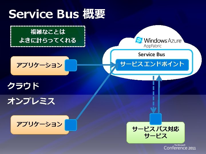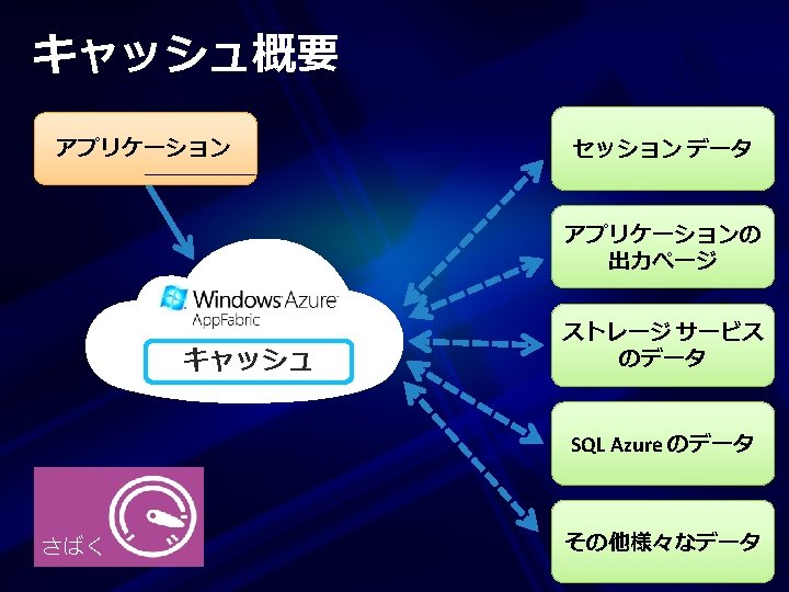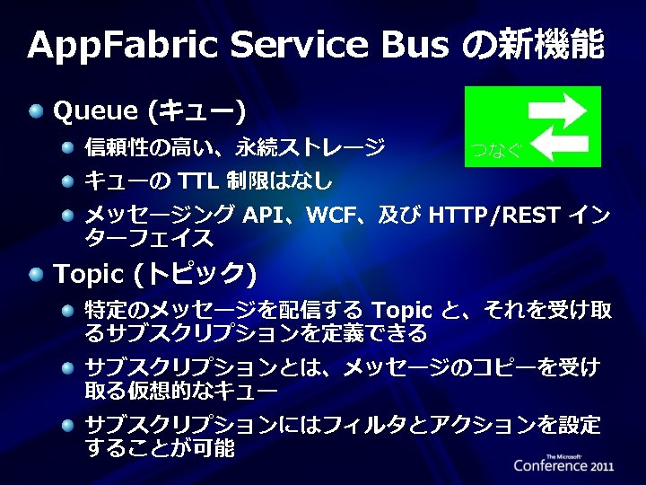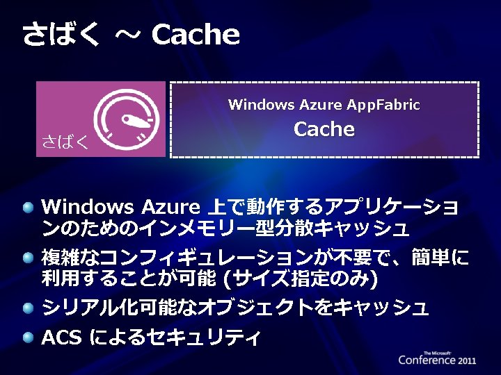Windows Azure App. Fabric 3つの基本機能 Windows Azure App. Fabric つなぐ Service Bus Windows Azure App. Fabric 認める Access Control Service Windows Azure App. Fabric さばく Cache
