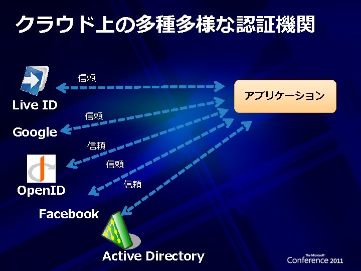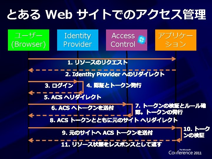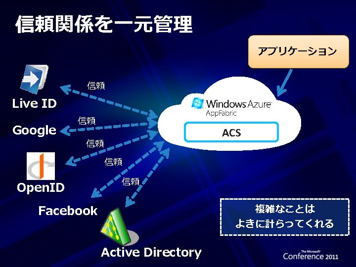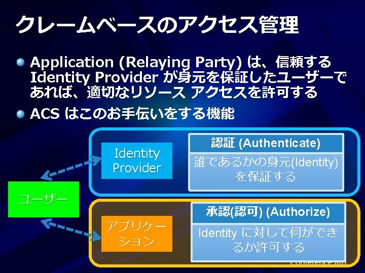 Access Control の特長 標準ペースの ID プロバイダーをサポート エンタープライズ ディレクトリ (Active Directory Federation Server v 2. 0) Web アイデンティティ (Windows Live ID、Google、 Yahoo!、Open. ID、Facebook) プロトコルのサポート OAuth WRAP、WS-Trust、および WS-Federation トークン フォーマットのサポート SAML 1. 1、SAML 2. 0、および Simple Web Token Windows Phone、i. Phone、Android 用 Toolkit