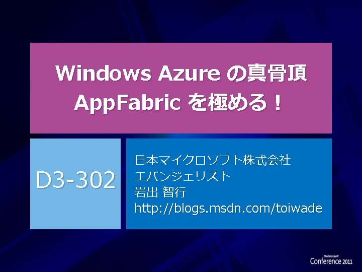 リファレンス スピーカー Blog http: //blogs. msdn. com/toiwade 青い空の向こうへ ~ 日本マイクロソフト クラウドチームの Blog http: //blogs. msdn. com/b/bluesky/ Windows Azure App. Fabric 概要 http: //msdn. microsoft. com/ja-jp/windowsazure/hh 307616 ブチザッキ ~ Windows Azure MVP 亀渕さんの Blog http: //buchizo. wordpress. com/ Id. M実験室 ~ ILM MVP 富士榮さんの Blog http: //idmlab. eidentity. jp/