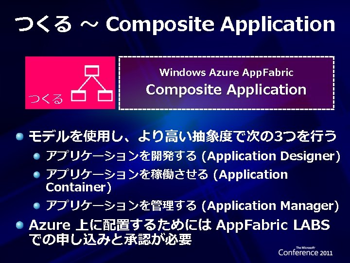 Windows Azure App. Fabric 今後リリース予定の 2つの機能 Windows Azure App. Fabric 纏める Integration Windows Azure App. Fabric つくる Composite Application App. Fabric Labs 正式リリース前の App. Fabric の機能をお試し利用