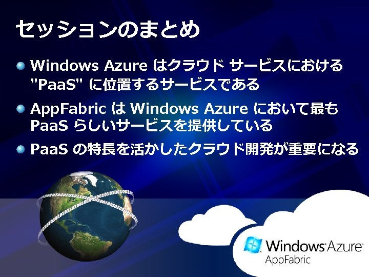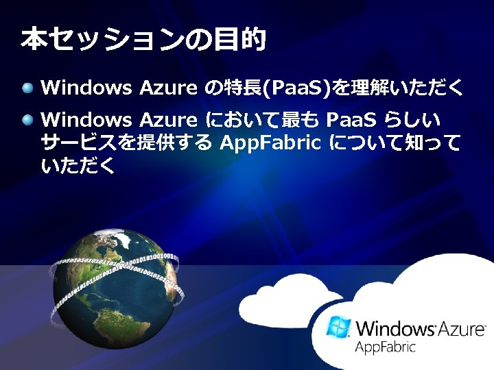ソフトウェア環境について (2) Windows Azure App. Fabric SDK CTP http: //www. microsoft. com/download/en/details. aspx? id= 17691 (Visual Studio 用ツール、およびサンプル コード集) Windows Azure Platform Training Kit http: //www. microsoft. com/download/en/details. aspx? id= 8396 Windows Azure App. Fabric 実サービス:http: //appfabric. azure. com/ プレビュー:App. Fabric LABS http: //portal. appfabriclabs. com/