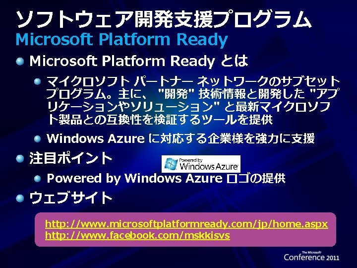 事例: Outback ステーキ Facebook ファンページを利用し、先着50万名 にクーポンを配布するキャンペーン Amazon、Google、Microsoft のクラウド サー ビスを比較 "With Amazon, we’d have had to set up the infrastructure and all the servers and make a lot of back-end services decisions. And the Google programming interface takes too long to learn. " Azure を採用し 8週間でサイトを構築 18日で目標の 50万人のプロファイルを獲得 ピークに合わせたコンピューター リソースの利用 http: //www. microsoft. com/casestudies/Case_Study_Detail. aspx ? casestudyid=4000005861