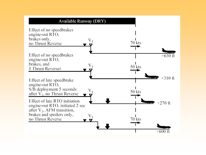 Takeoff Distances • TORA- Take. Off Run Available. This is the physical runway limited by obstacle free requirements • ASDA - Accelerate-Stop Distance Available. This is the distance available for accelerating to V 1 and then stopping. It may include the physical runway and any stopway available • TODA - Take. Off Distance Available. This is the distance available to achieve V 2 at the appropriate screen height. It may include physical runway, stopway and clearway • Note: Not more than ½ the Air Distance may be in the Clearway (Air Distance is distance from lift-off to 35 ft) • The Takeoff Run is defined as the distance from brake release to ½ the Air Distance • Wet Runway calculations do not allow use of Clearway