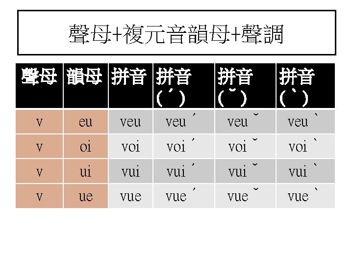 聲母+複元音韻母+聲調 聲母 韻母 拼音 拼音 (ˊ) 拼音 (ˇ) 拼音 (ˋ) ng eu ngeuˊ ngeuˇ ngeuˋ ng oi ngoiˊ ngoiˇ ngoiˋ ng ua nguaˊ nguaˇ nguaˋ ng ui nguiˊ nguiˇ nguiˋ ng ue ngueˊ ngueˇ ngueˋ