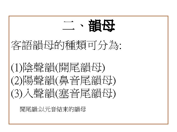 聲母+複元音韻母+聲調 聲母 韻母 拼音 拼音 (ˊ) 拼音 (ˇ) 拼音 (ˋ) k ia kiaˊ kiaˇ kiaˋ k io kioˊ kioˇ kioˋ k ie kieˊ kieˇ kieˋ k iu kiuˊ kiuˇ kiuˋ k ai kaiˊ kaiˇ kaiˋ k au kauˊ kauˇ kauˋ