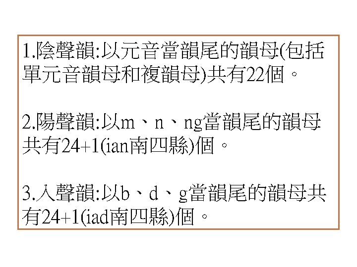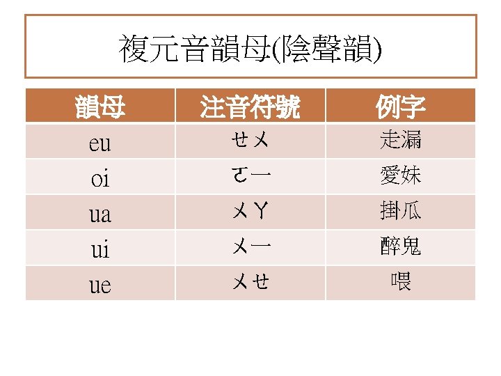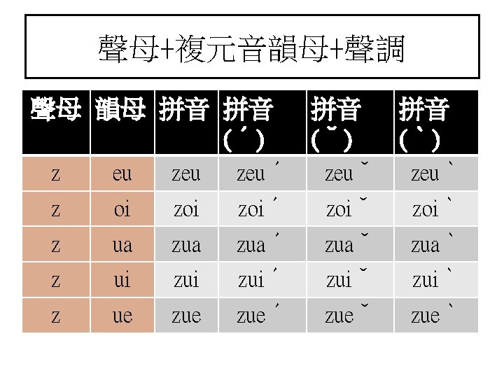 聲母+複元音韻母+聲調 聲母 韻母 拼音 拼音 (ˊ) 拼音 (ˇ) 拼音 (ˋ) p ia piaˊ piaˇ piaˋ p io pioˊ pioˇ pioˋ p ie pieˊ pieˇ pieˋ p iu piuˊ piuˇ piuˋ p ai paiˊ paiˇ paiˋ p au pauˊ pauˇ pauˋ