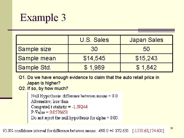 Example 3 Sample size Sample mean Sample Std. U. S. Sales 30 $14, 545 $ 1, 989 Japan Sales 50 $15, 243 $ 1, 842 Q 1. Do we have enough evidence to claim that the auto retail price in Japan is higher? Q 2. If so, by how much? 10