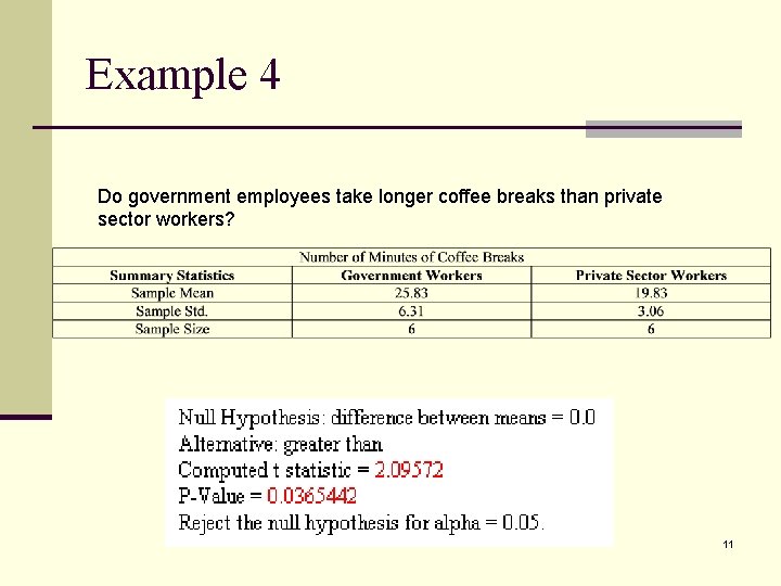 Example 4 Do government employees take longer coffee breaks than private sector workers? 11