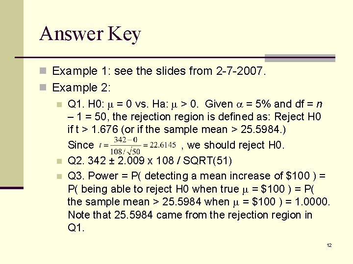 Answer Key n Example 1: see the slides from 2 -7 -2007. n Example 2: n Q 1. H 0: m = 0 vs. Ha: m > 0. Given a = 5% and df = n – 1 = 50, the rejection region is defined as: Reject H 0 if t > 1. 676 (or if the sample mean > 25. 5984. ) Since , we should reject H 0. n Q 2. 342 ± 2. 009 x 108 / SQRT(51) n Q 3. Power = P( detecting a mean increase of $100 ) = P( being able to reject H 0 when true m = $100 ) = P( the sample mean > 25. 5984 when m = $100 ) = 1. 0000. Note that 25. 5984 came from the rejection region in Q 1. 12