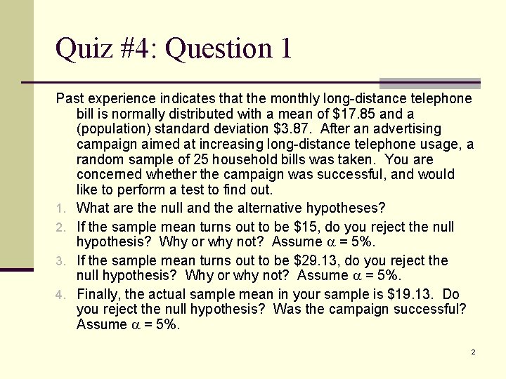 Quiz #4: Question 1 Past experience indicates that the monthly long-distance telephone bill is normally distributed with a mean of $17. 85 and a (population) standard deviation $3. 87. After an advertising campaign aimed at increasing long-distance telephone usage, a random sample of 25 household bills was taken. You are concerned whether the campaign was successful, and would like to perform a test to find out. 1. What are the null and the alternative hypotheses? 2. If the sample mean turns out to be $15, do you reject the null hypothesis? Why or why not? Assume a = 5%. 3. If the sample mean turns out to be $29. 13, do you reject the null hypothesis? Why or why not? Assume a = 5%. 4. Finally, the actual sample mean in your sample is $19. 13. Do you reject the null hypothesis? Was the campaign successful? Assume a = 5%. 2