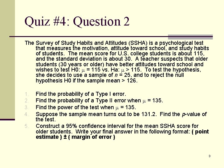 Quiz #4: Question 2 The Survey of Study Habits and Attitudes (SSHA) is a psychological test that measures the motivation, attitude toward school, and study habits of students. The mean score for U. S. college students is about 115, and the standard deviation is about 30. A teacher suspects that older students (30 years or older) have better attitudes toward school and wishes to test H 0: m = 115 vs. Ha: m > 115. To test the hypothesis, she decides to use a sample of n = 25, and to reject the null hypothesis H 0 if the sample mean > 126. 1. 2. 3. 4. 5. Find the probability of a Type I error. Find the probability of a Type II error when m = 135. Find the power of the test when m = 135. Suppose the sample mean turns out to be 131. 2. Find the p-value of the test. Construct a 95% confidence interval for the mean SSHA score for older students. Write your final answer in the following format: ( point estimate ) ± ( margin of error ) 3