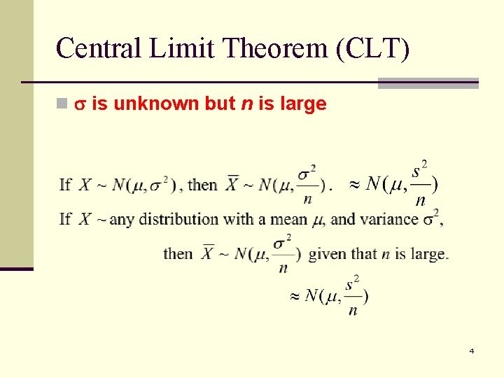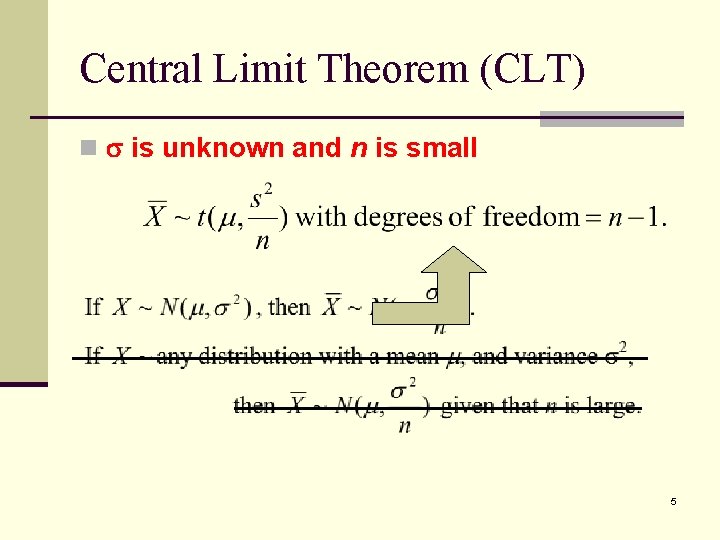 Central Limit Theorem (CLT) n s is unknown but n is large 4