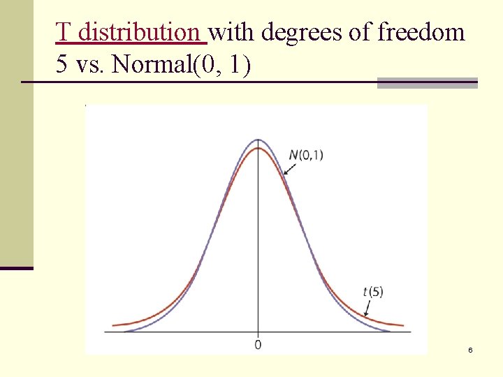 T distribution with degrees of freedom 5 vs. Normal(0, 1) 6